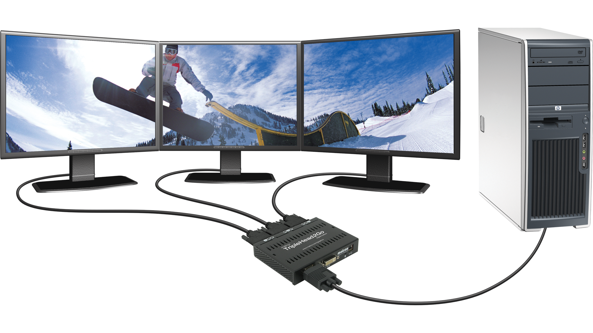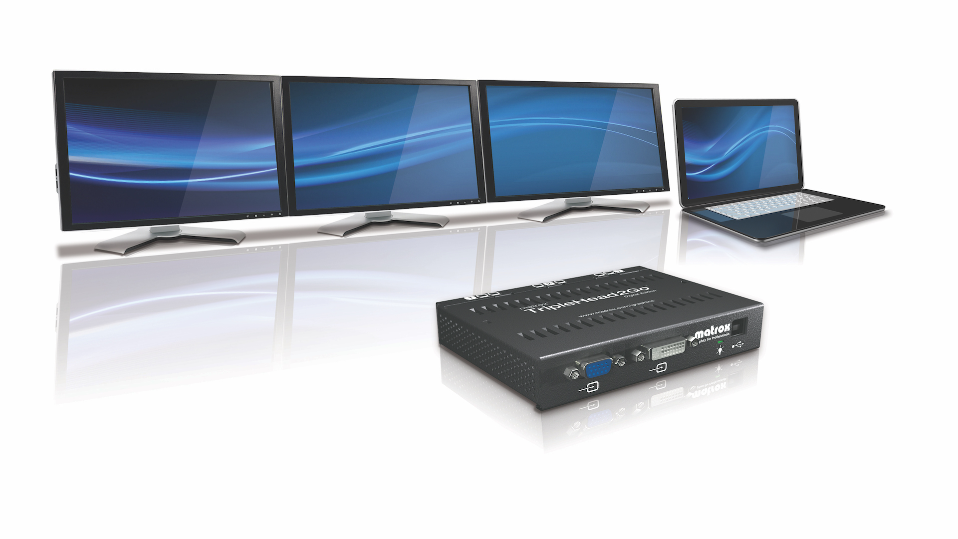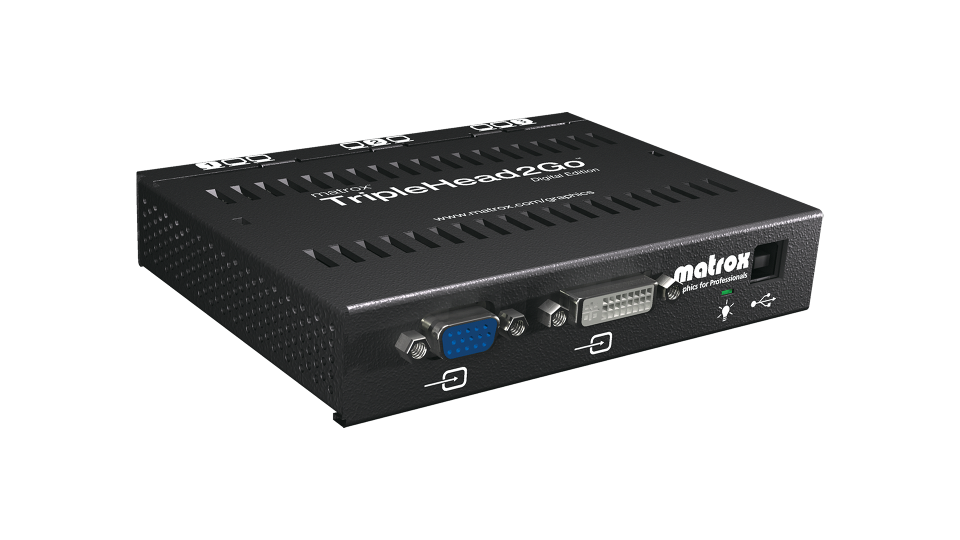The Matrox TripleHead2Go Digital Edition external multi-display adapter adds up to three monitors to your laptop or desktop computer. It connects to the video output of your system and uses the system's existing GPU to provide high-quality, uncompressed graphics and video across all monitors. Ideal for professionals requiring more desktop space for maximum productivity and gamers wanting a totally immersive experience, this little black box lets you run different applications on each display or view one application across multiple monitors. Organize your workspace more efficiently, multi-task more comfortably and make fewer errors with a Matrox TripleHead2Go-powered multi-monitor setup.
