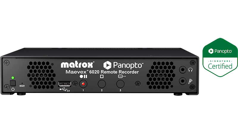 L’enregistreur à distance Matrox® Maevex 6020 est un multiencodeur/enregistreur pour la diffusion en continu certifié Panopto™, spécialement conçu pour (et complètement intégré dans) le système de gestion vidéo (VMS) de Panopto. Le meilleur de la solution infonuagique de Panopto (la diffusion, la programmation et la gestion) est disponible pour le Maevex 6020. L’enregistreur à distance Maevex 6020 améliore la solution VMS de Panopto en fournissant des fonctionnalités de diffusion et d’enregistrement en direct pour les entreprises et les universités.