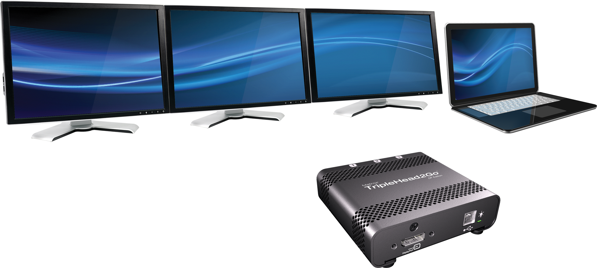 The Matrox TripleHead2Go DP Edition external multi-display adapter adds up to three monitors to your laptop or desktop computer. It connects to the video output of your system and uses the system's existing GPU to provide high-quality, uncompressed graphics and video across all monitors. Ideal for professionals requiring more desktop space for maximum productivity and gamers wanting a totally immersive experience, this little black box lets you run different applications on each display or view one application across multiple monitors.