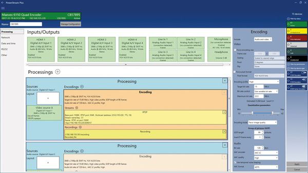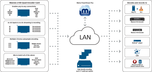 Drive four 4K/UHD and Full HD capture, encode, stream, and record—simultaneously from a single PCIe® card. A native network jack on the Maevex 6100 card eliminates reliance on the host computers’ network. PC independence means there’s no need for a driver and no system bus data transfer is required or executed—all processing is performed on the card itself. Streams and recordings are sent over the Maevex 6100’s independent network connector, and only power is taken from the host system’s PCIe bus. Maevex 6100 cards can be placed into available slots in existing systems without compromising system integrity and stability, and make minimal power consumption demands of the PC system.
